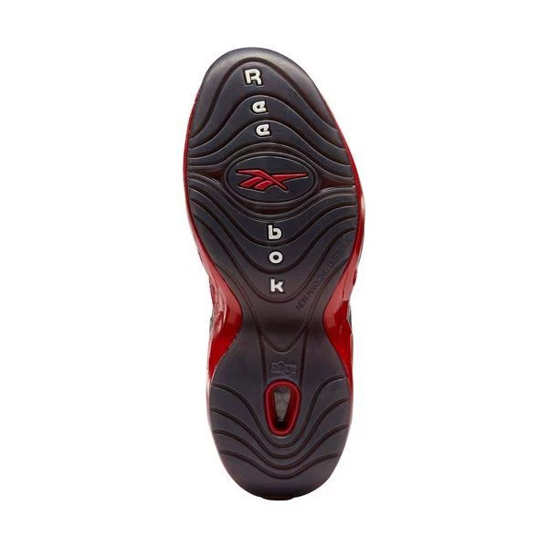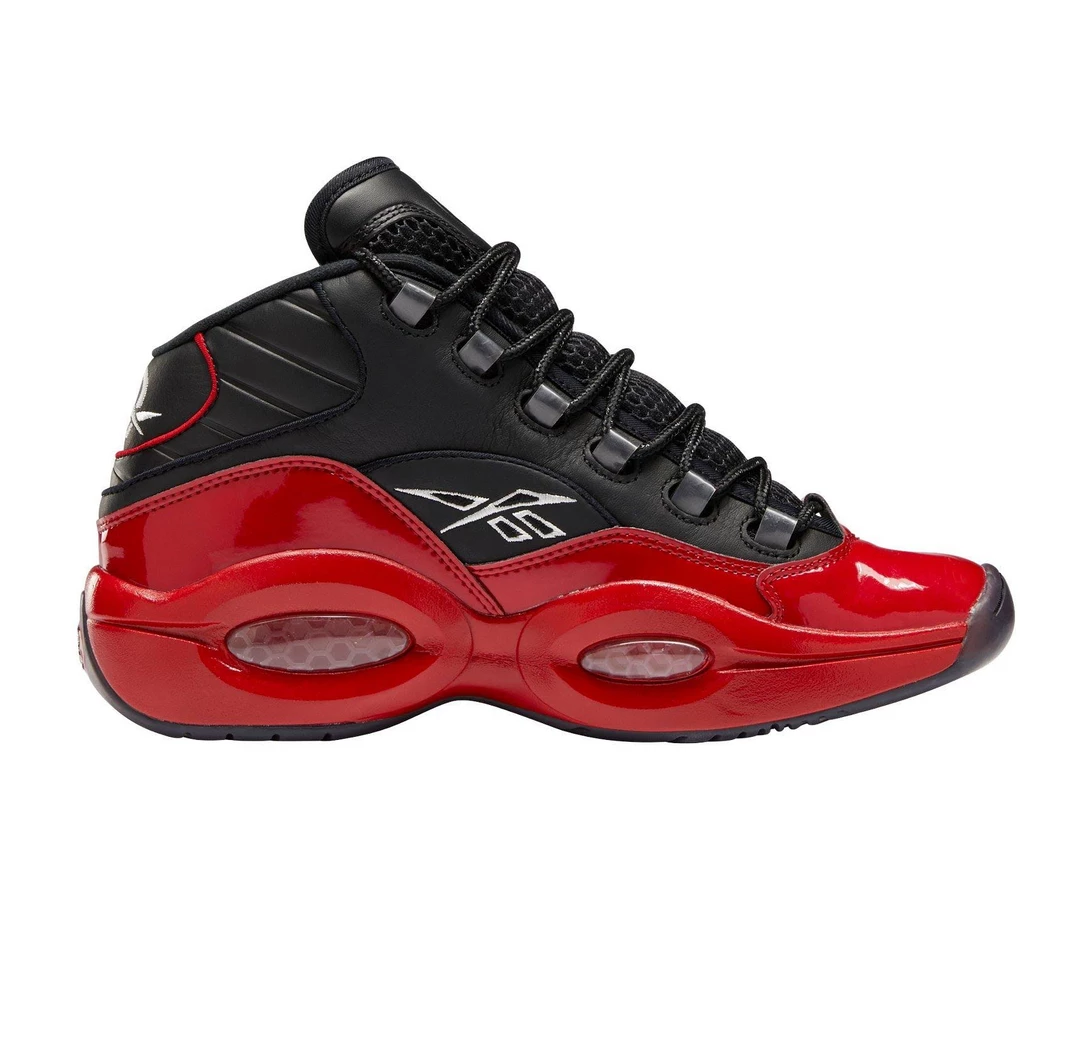 The Reebok Question Mid “Street Sleigh” presents a two-tone colorway of Allen Iverson’s debut signature shoe, highlighted by a black leather upper with red patent leather on the mudguard and toe cap.